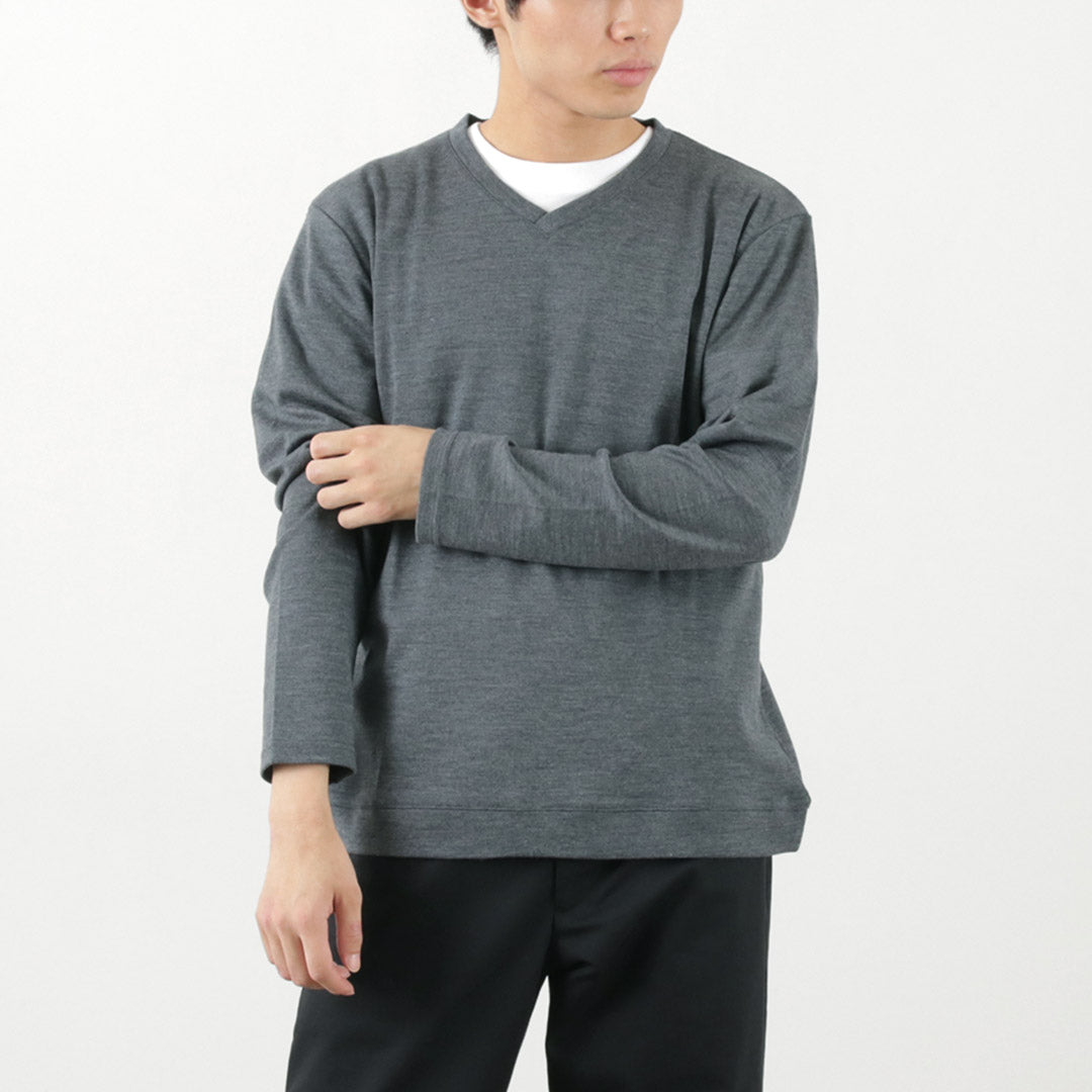 "Dress Wool" es un tejido de punto de alta calibre lavable hecho de lana 100% fina, que ha sido producida por RE desde el establecimiento de la marca. Este delgado modelo de cuello en V es útil como top y ropa interior para las temporadas de otoño e invierno.