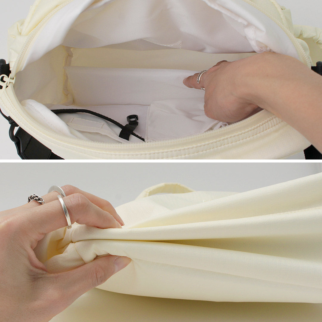 Los bolsillos Drawcord se proporcionan en ambos lados de la bolsa. Al atar el Drawcord, puede almacenar de forma segura no solo botellas de PET y botellas de agua sino también artículos pequeños. Además, es un buen punto que se puede unir una correa para el hombro al anillo D en la parte superior del bolsillo.