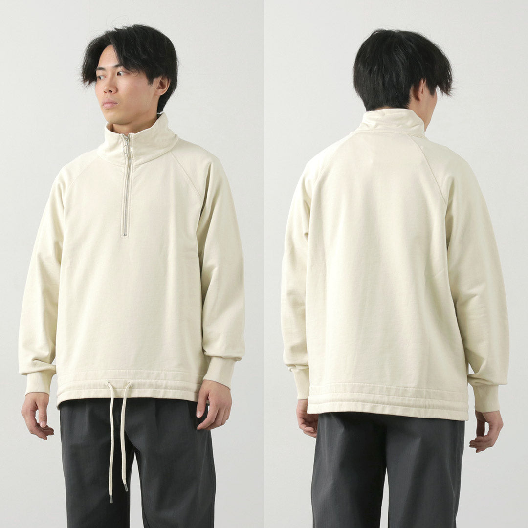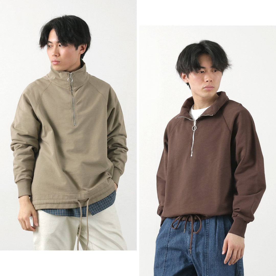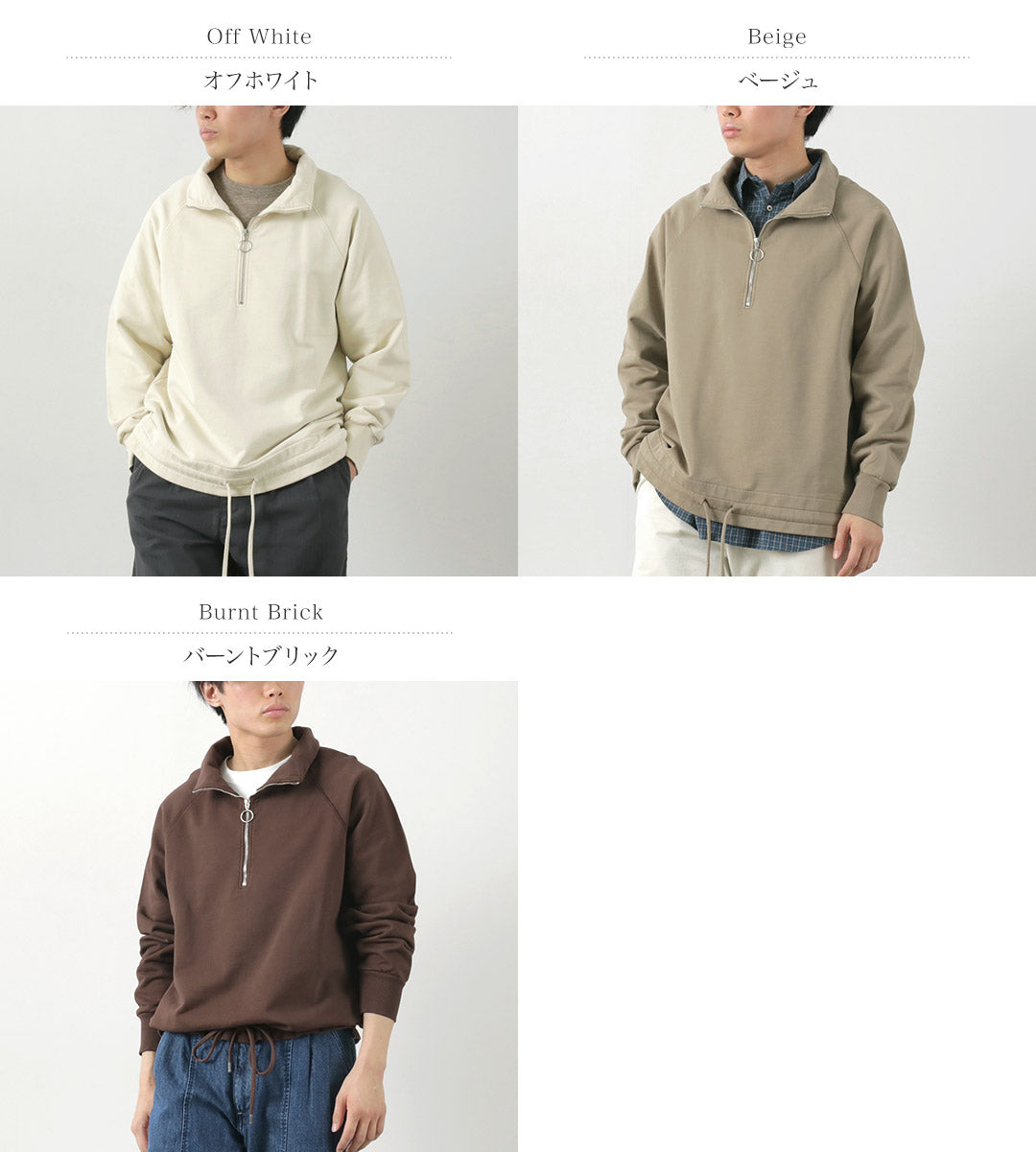 Il présente un demi-zip à l'encolure. Légèrement ouvert dans un collier debout pour un look sportif, ou complètement fermé pour une apparence semblable à un col roulé. De plus, en ouvrant et en pliant complètement le collier debout, il peut également être fait pour ressembler à un collier d'aile. Que ce soit ouvert ou fermé, il ajoute à l'apparence globale, et il se marie bien avec des chemises ou des t-shirts pour la superposition.