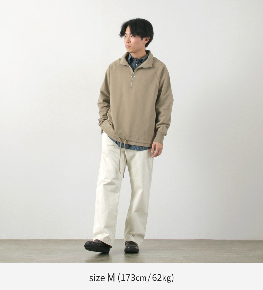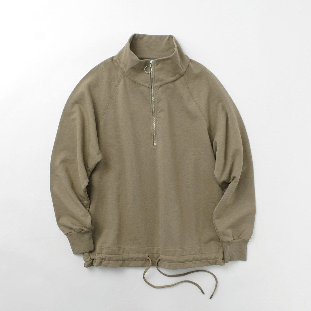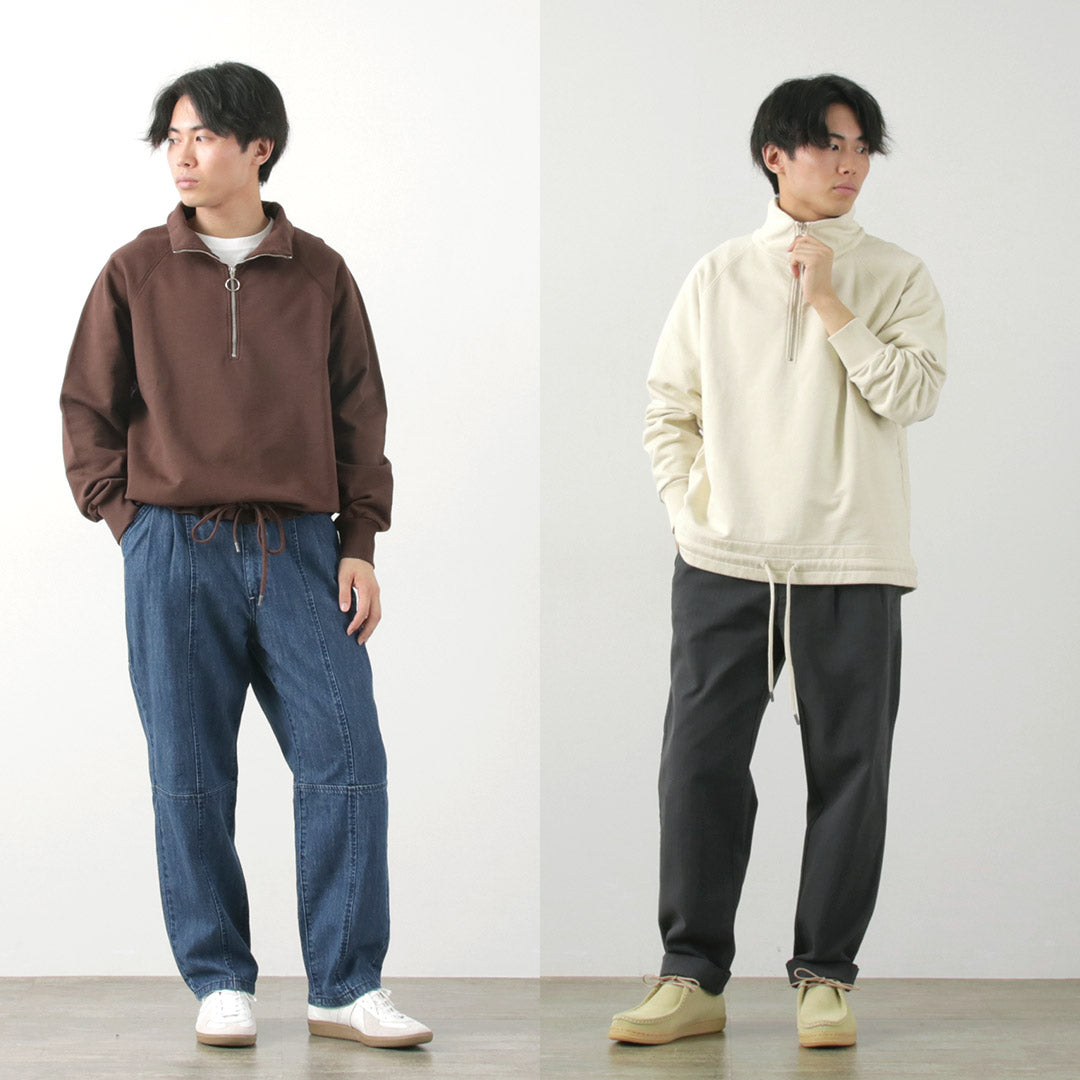 Il présente un demi-zip à l'encolure. Légèrement ouvert dans un collier debout pour un look sportif, ou complètement fermé pour une apparence semblable à un col roulé. De plus, en ouvrant et en pliant complètement le collier debout, il peut également être fait pour ressembler à un collier d'aile. Que ce soit ouvert ou fermé, il ajoute à l'apparence globale, et il se marie bien avec des chemises ou des t-shirts pour la superposition.