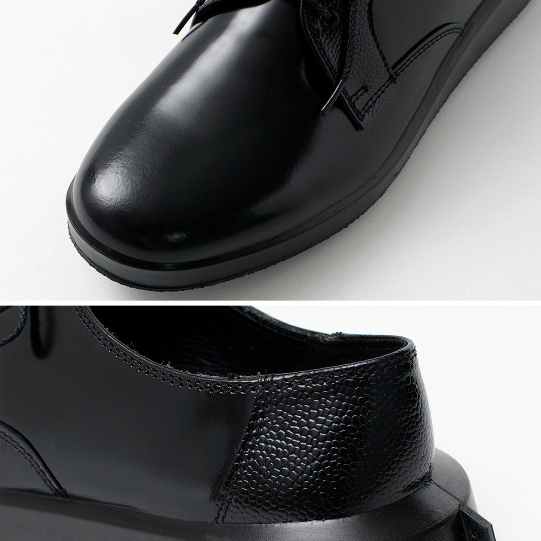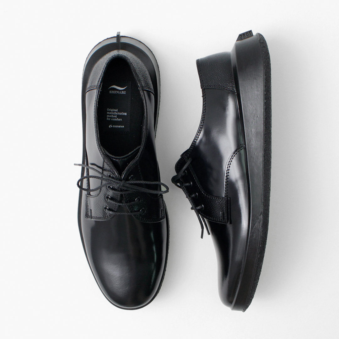 Combiner l'élégance et la confortation "Shinari" est une nouvelle ligne de chaussures de Moonstar. Cette série intègre des éléments de conception des archives de Moonstar, principalement des chaussures en cuir, dans une forme unique qui crée un amorti en fléchissant la semelle extérieure. La simple plaine de derby "Sumen (surface nue)" est une paire élégante avec ses motifs de couture et de chevauchement de plumes caractéristiques, mais confortable et facile sur les pieds.