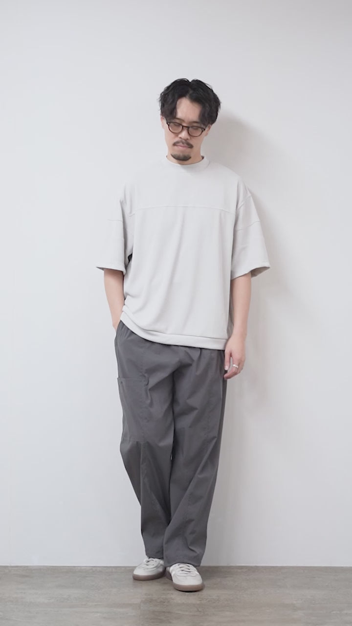 Coupée dans une silhouette décontractée avec suffisamment d'espace, la ligne centrale est cousue plutôt que pressée, soulignant une ligne verticale sans compter sur des plis. Le résultat est une impression nette et épurée.