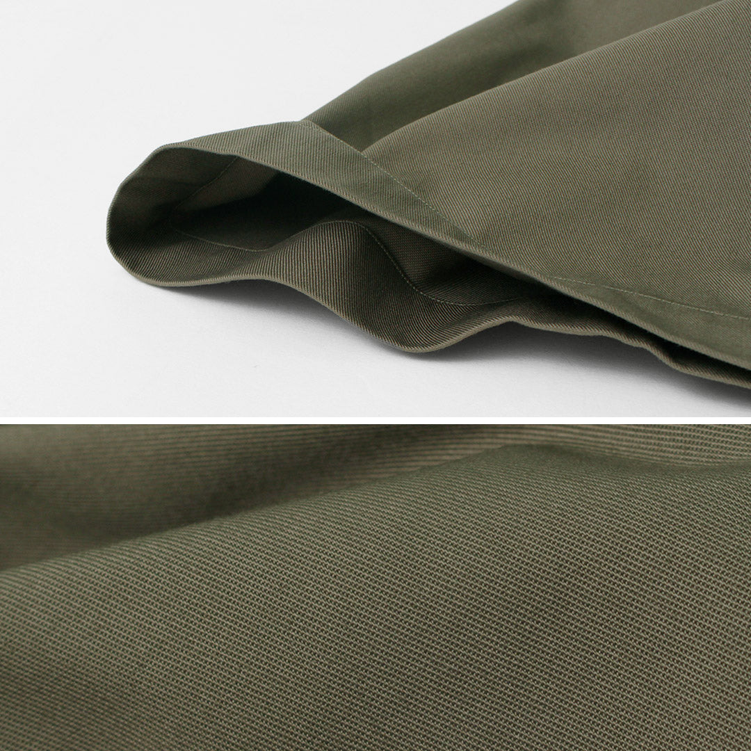 Le tissu est un twill de coton et de polyester T / C, qui est souvent utilisé dans les vêtements de travail. Sa fermeté et son éclat modéré lui donnent une impression élégante.