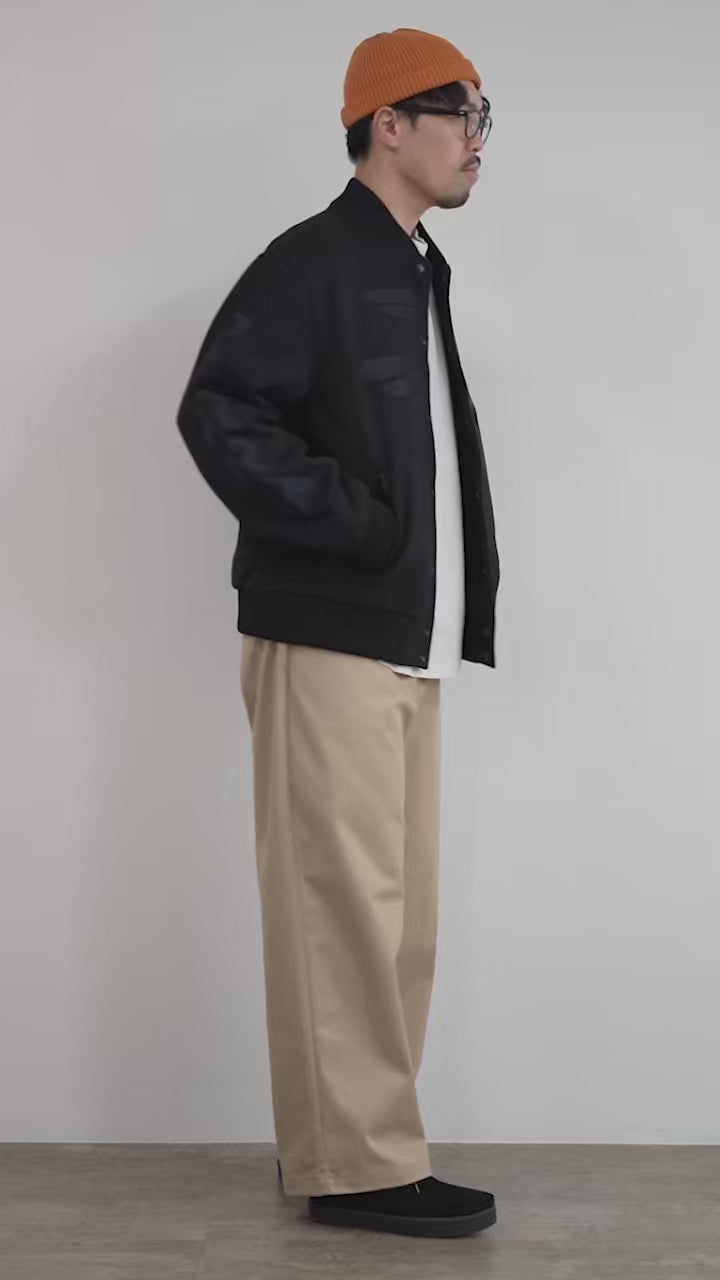 Based on the classic varsity jacket, this piece has been reworked into a sophisticated pattern that conveys an urban vibe. Despite the volume of its form, the silhouette naturally conforms to the body, making it versatile and easy to style. This piece subtly integrates art into everyday wear.