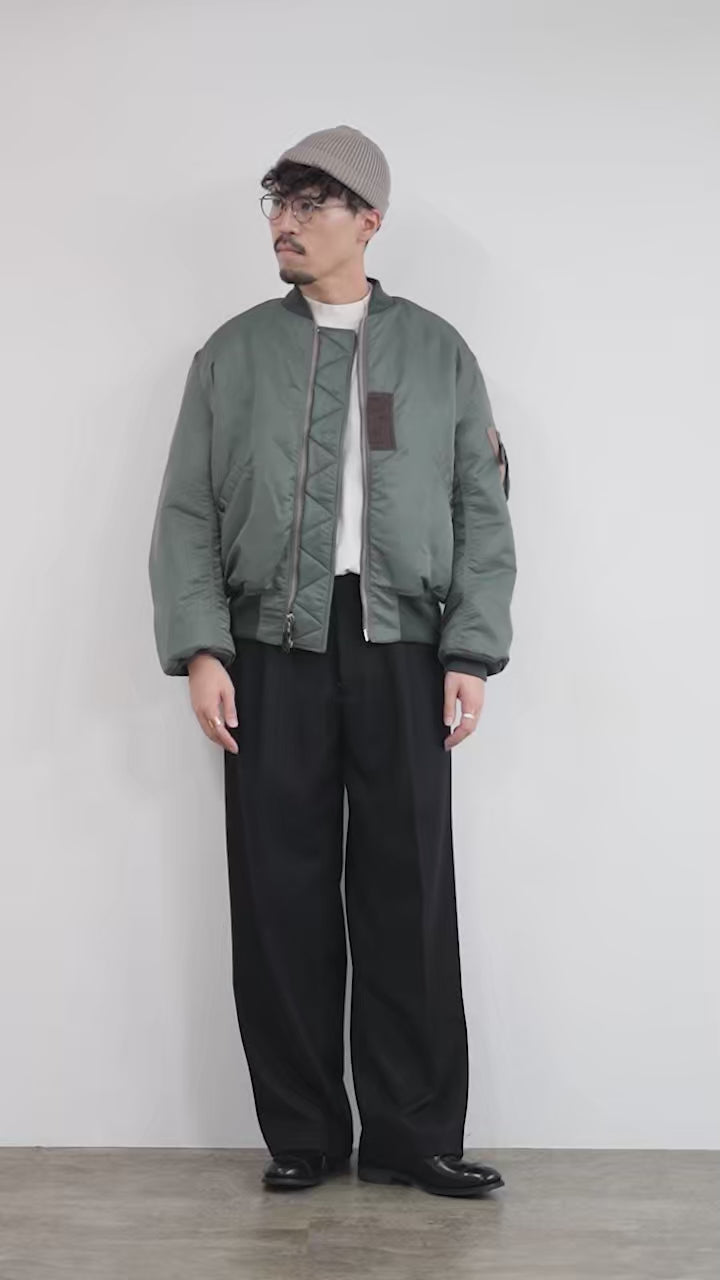 ● Staff (177cm / 67kg) Build: Average Wearing: Size L / XL Size L fits perfectly. The body has enough room for easy movement, and the rugged MA-1 silhouette shows well. The length is short, making it great for layering with innerwear. Size XL provides a more dropped shoulder and a trendy oversized fit. |
