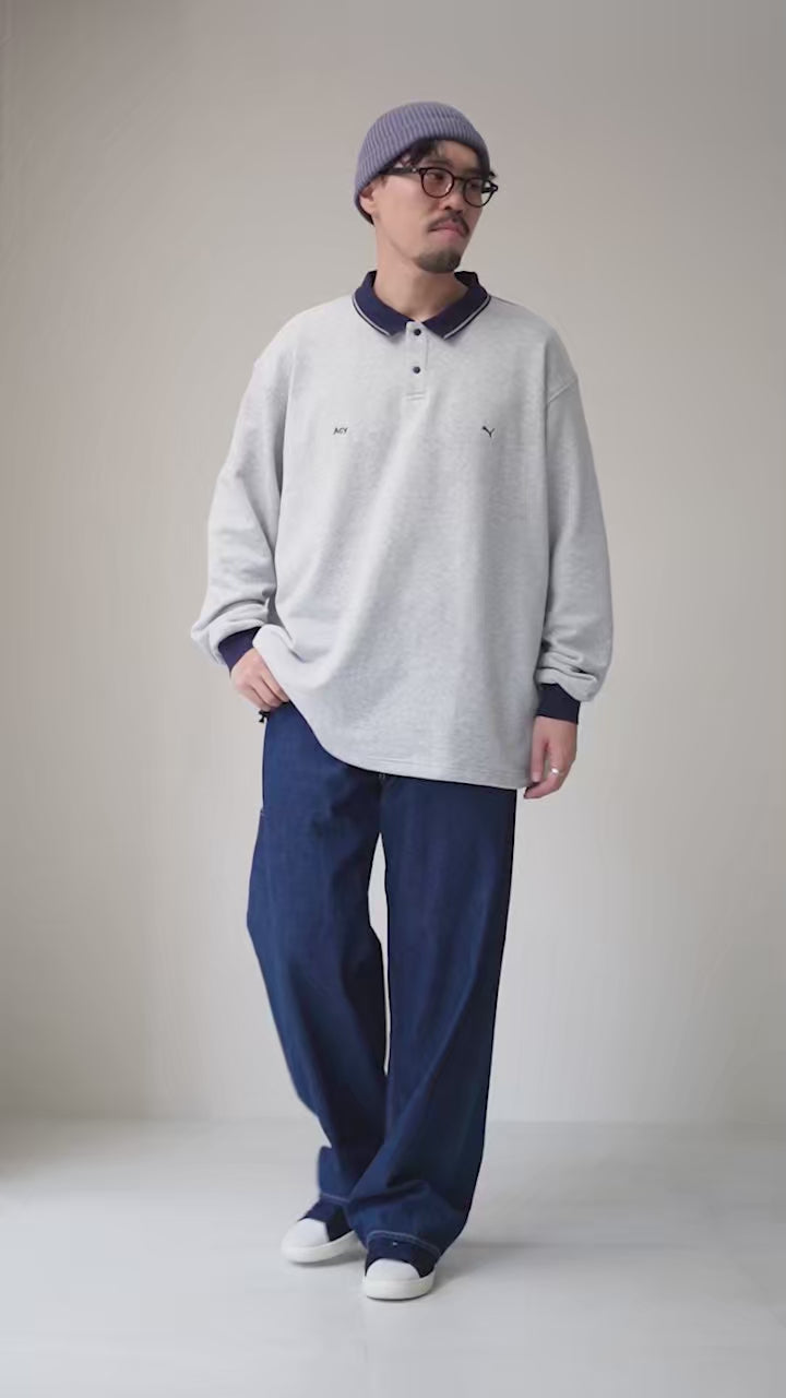 | ● Staff (177cm / 67kg) Build: Regular Wearing: Size L A relaxed fit with a natural shoulder drop and wide body width. Despite the roomy cut, the half-button detail keeps the look neat and not overly casual. The length covers more than half of the hips for a well-balanced proportion. |