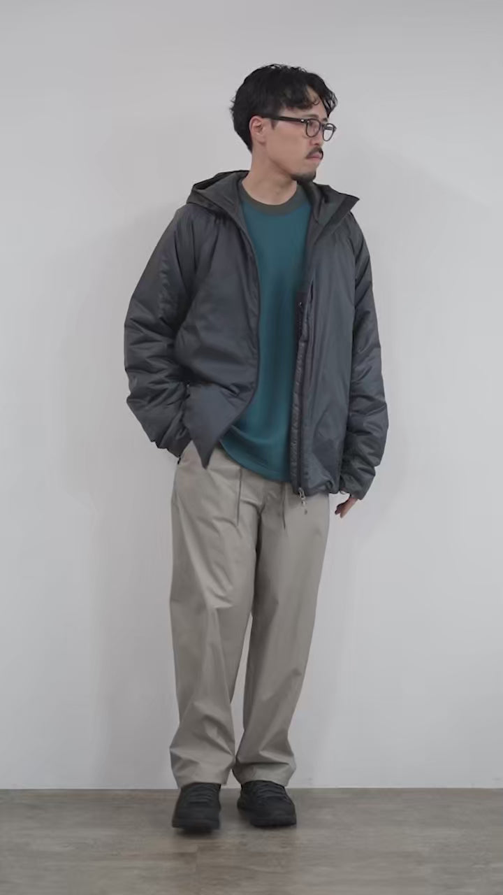 ●Staff (177cm / 67kg) Body type: Average Wearing size: L Has a relaxed fit with a bit of room. Worn over a sweatshirt, it doesn’t feel tight around the body. The sleeves reach the backs of the hands, and the length fully covers the hips. |