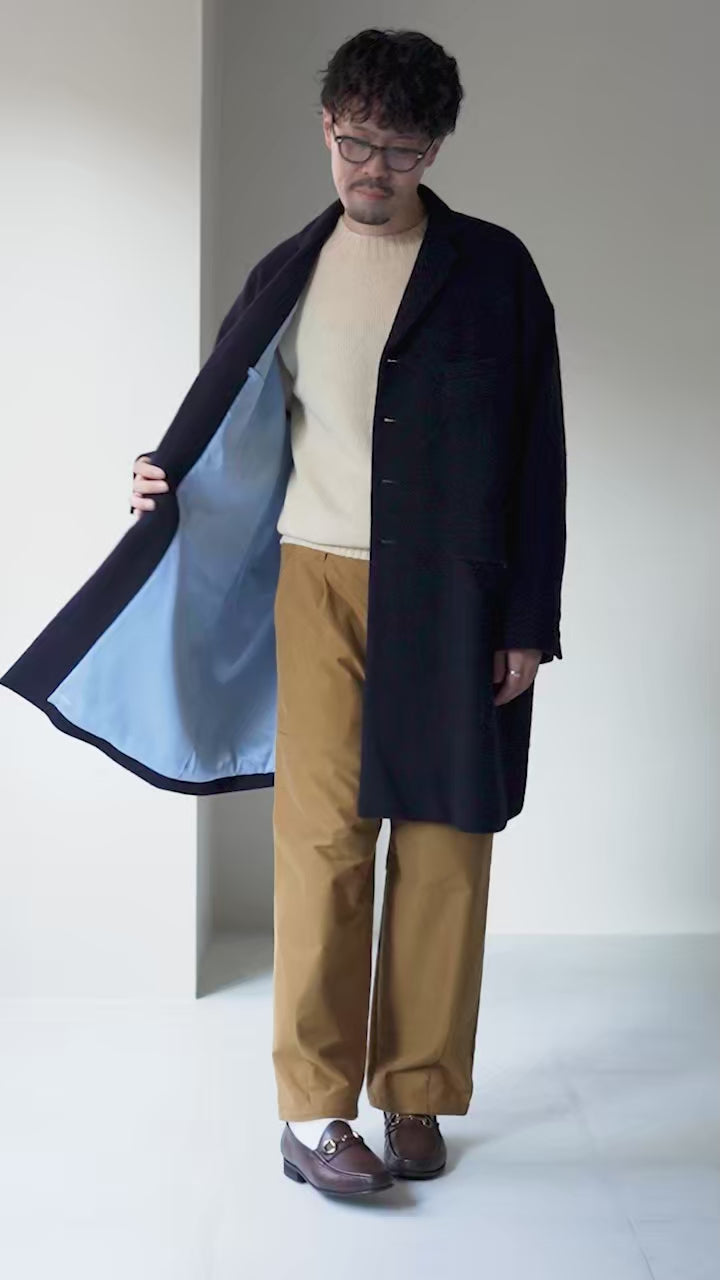While based on a classic Chester coat, the button placement and silhouette have been carefully refined to create a relaxed, modern balance. It layers comfortably over chunky knits and sweatshirts, and even works well in outer-on-outer styling.
