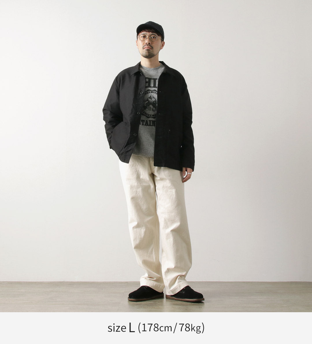 ●Staff (171cm / 61kg) Build: Average Wearing: Size S The fit is slightly relaxed, so S felt just right. The waist adjusts easily with a belt. With the volume of classic work pants balanced by a clean silhouette, this style works well even for a refined look. |