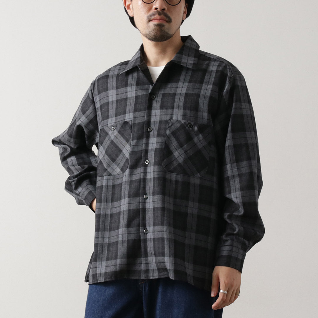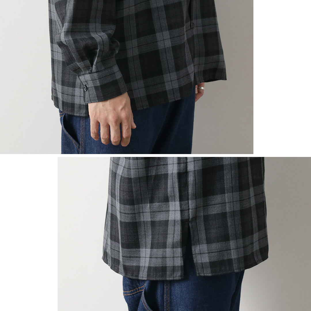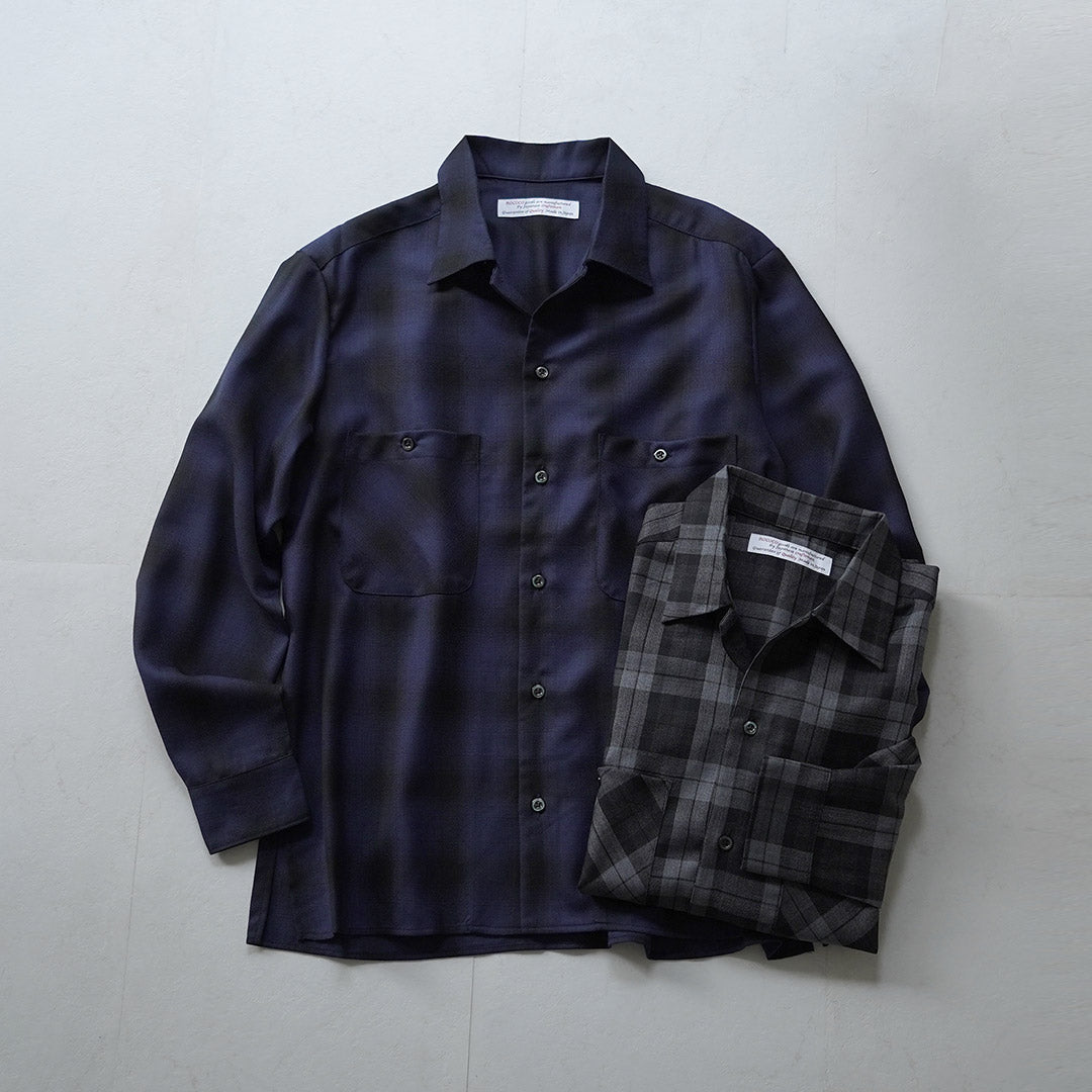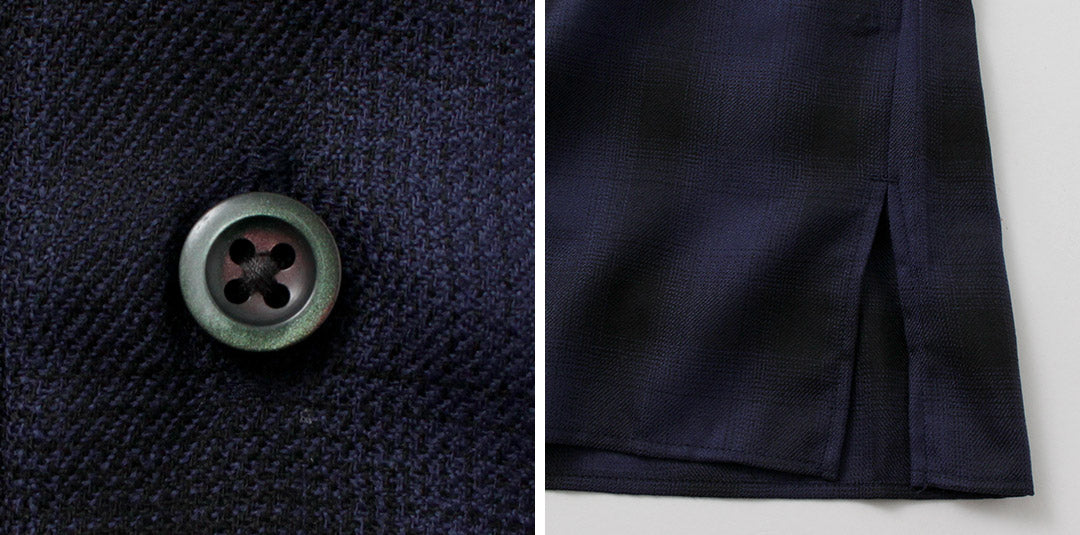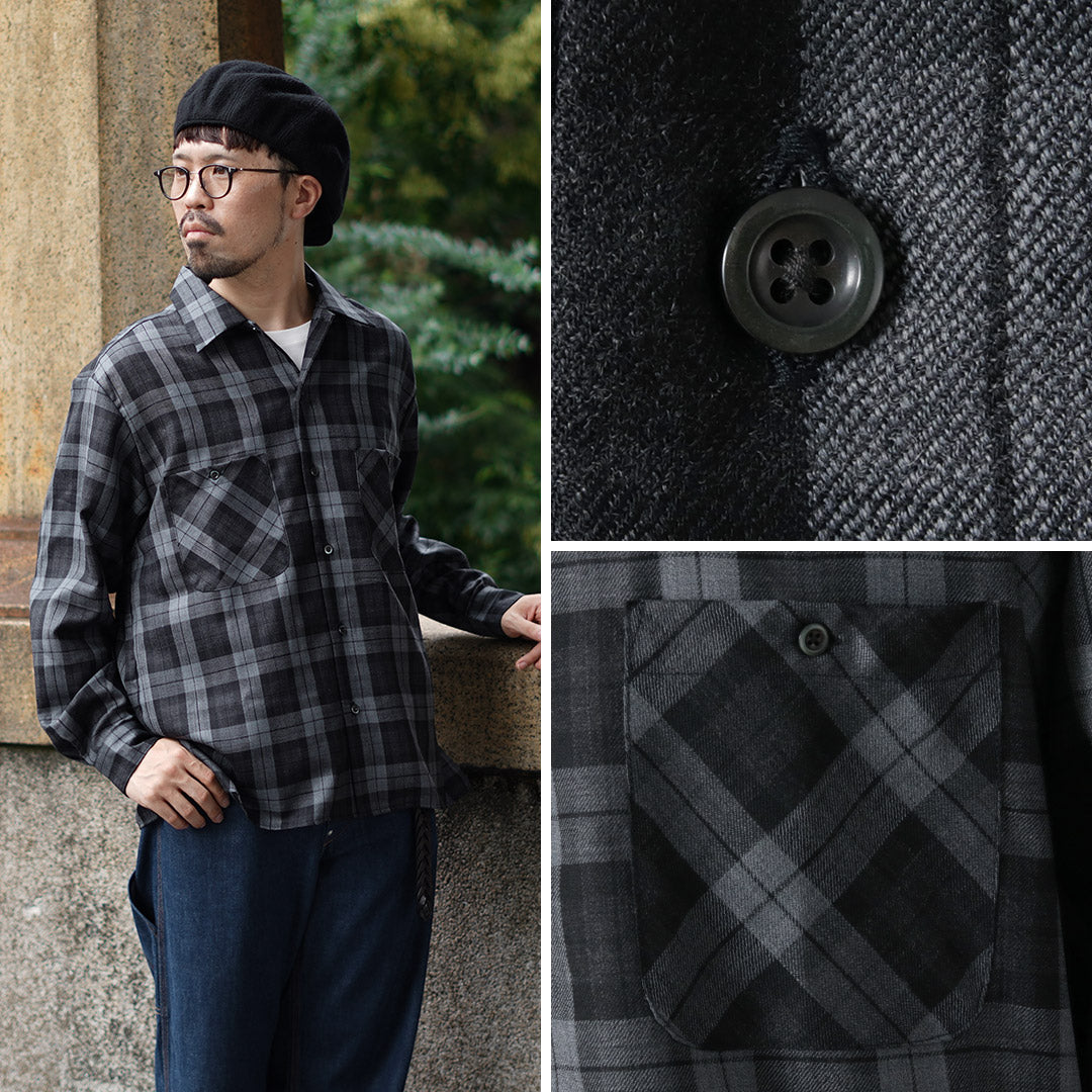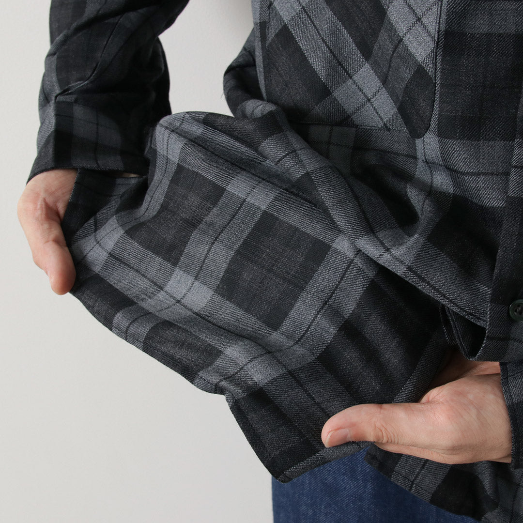 This shirt is made from a blend of wool and nylon that combines warmth and durability. It features a check pattern that differs depending on the color, and the stitching work has been kept to a minimum to give it a clean look.