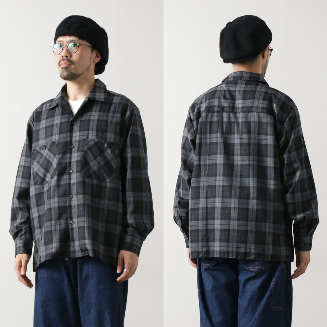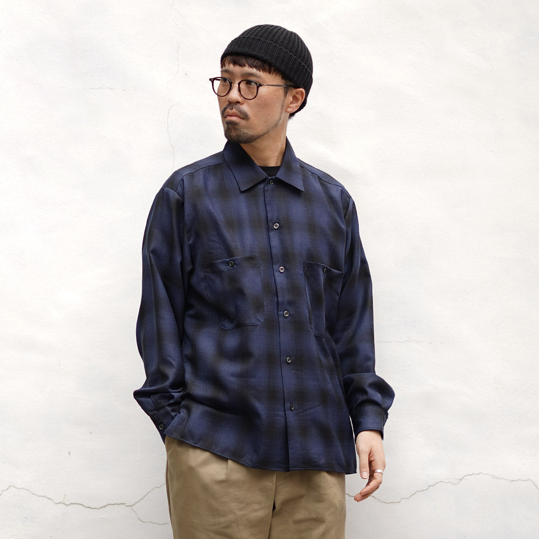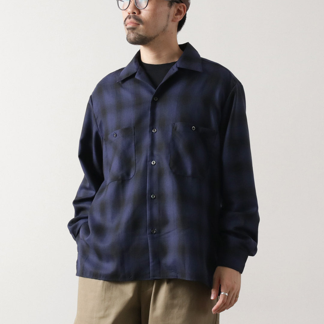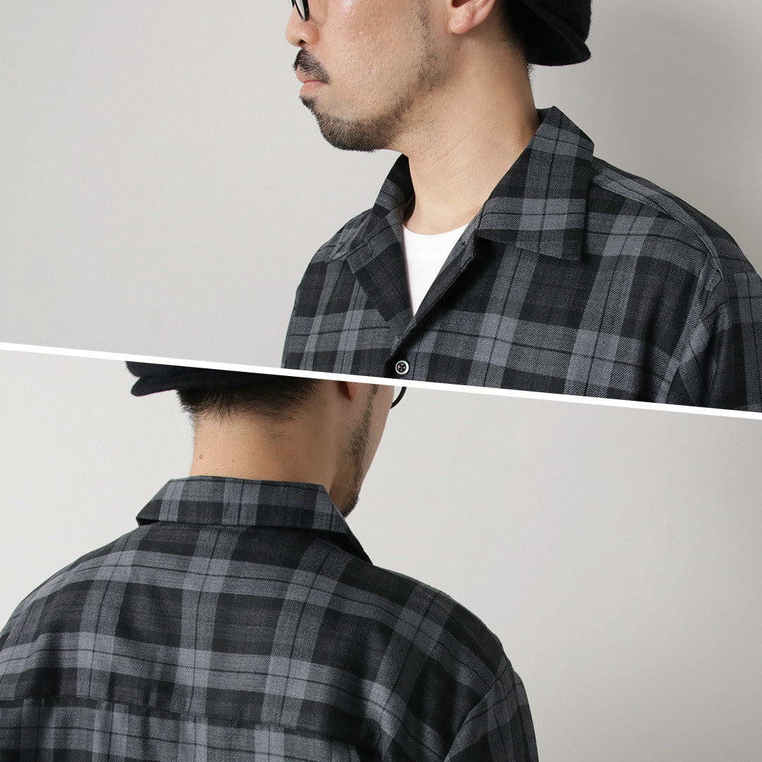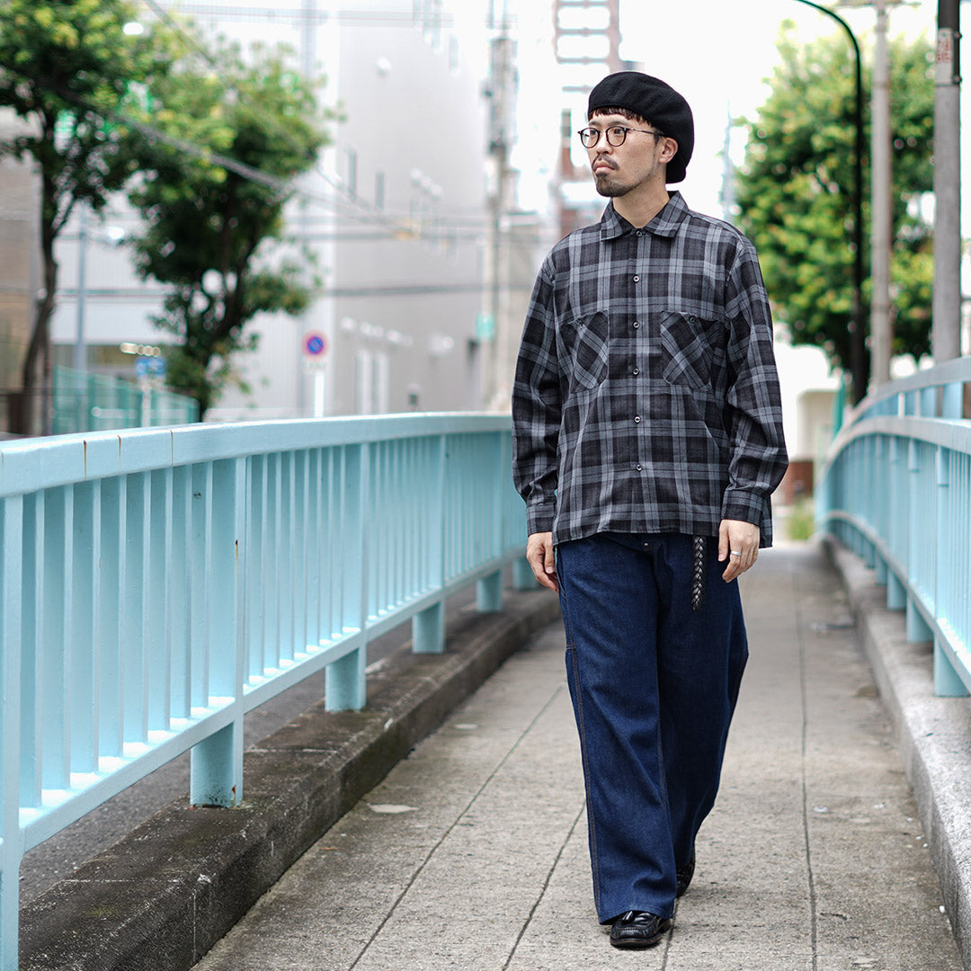 This shirt is made from a blend of wool and nylon that combines warmth and durability. It features a check pattern that differs depending on the color, and the stitching work has been kept to a minimum to give it a clean look.
