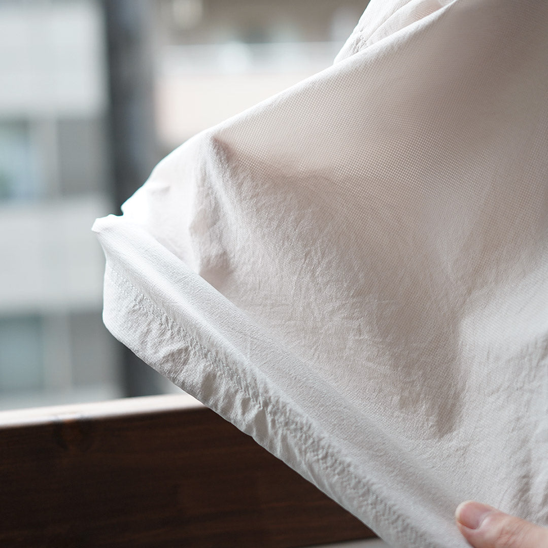 ●Staff (181cm/80kg) Body type: Broad Wearing size: XL Shoulders are slightly dropped, and the body fits with generous ease. Sleeves fall about 1–2cm above the elbows, and the hem fully covers the hips. Lightweight with a dry touch, this piece is ideal for warmer seasons. |