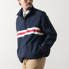 The jacket is made from lightweight, durable, quick-drying nylon Taslan fabric, with water-repellent properties. Despite its thinness, the fabric is tightly woven, making it perfect as an outer layer during cooler weather. Bold stripes, reminiscent of a rugby shirt, are created using a different material, adding a subtle three-dimensional effect.