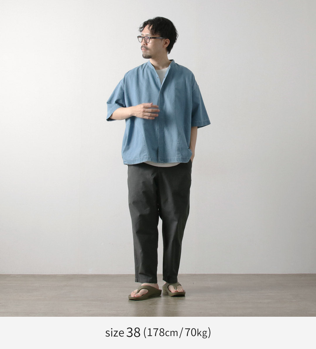 ●Staff (181cm / 80kg) Body type: Broad Wearing size: 40 With dropped shoulders, the sleeves fully cover the elbows. The fit is roomy without looking overly casual, maintaining a clean, relaxed impression. |