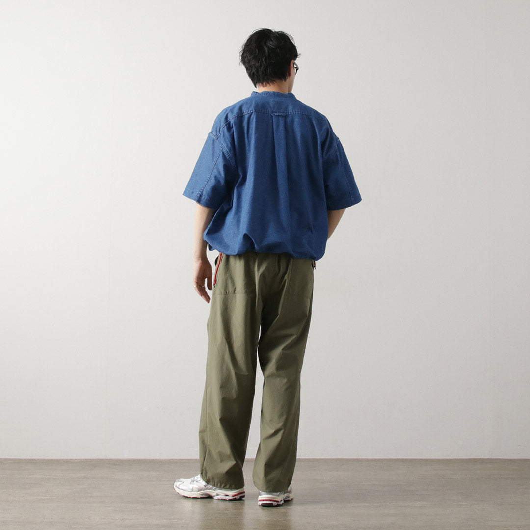 The neckline features a snap-button band collar, creating a refined look without becoming overly casual.