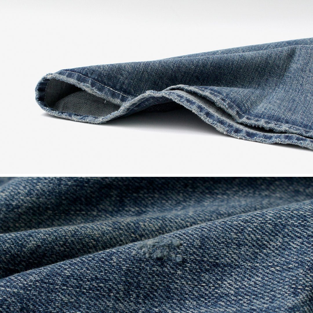 Made from 12.75oz denim with a moderate thickness. The fabric has been treated with distressing, resulting in a soft, vintage-inspired texture.