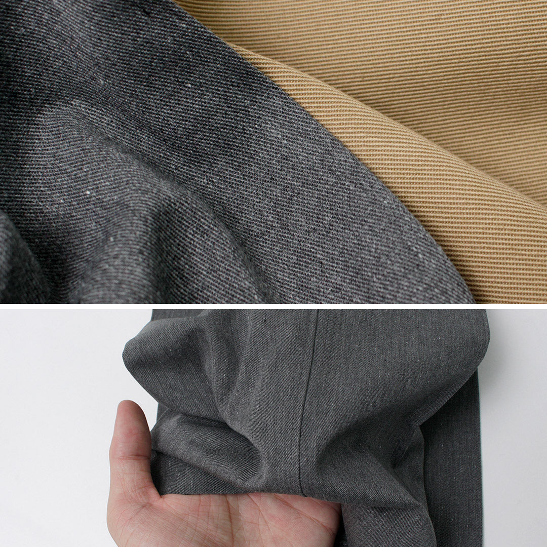 The fabric uses traditional single-ply yarn with a loose twist for a soft, supple feel. While the exterior has a casual appearance, the interior boasts tailored craftsmanship, making this a meticulously crafted piece.