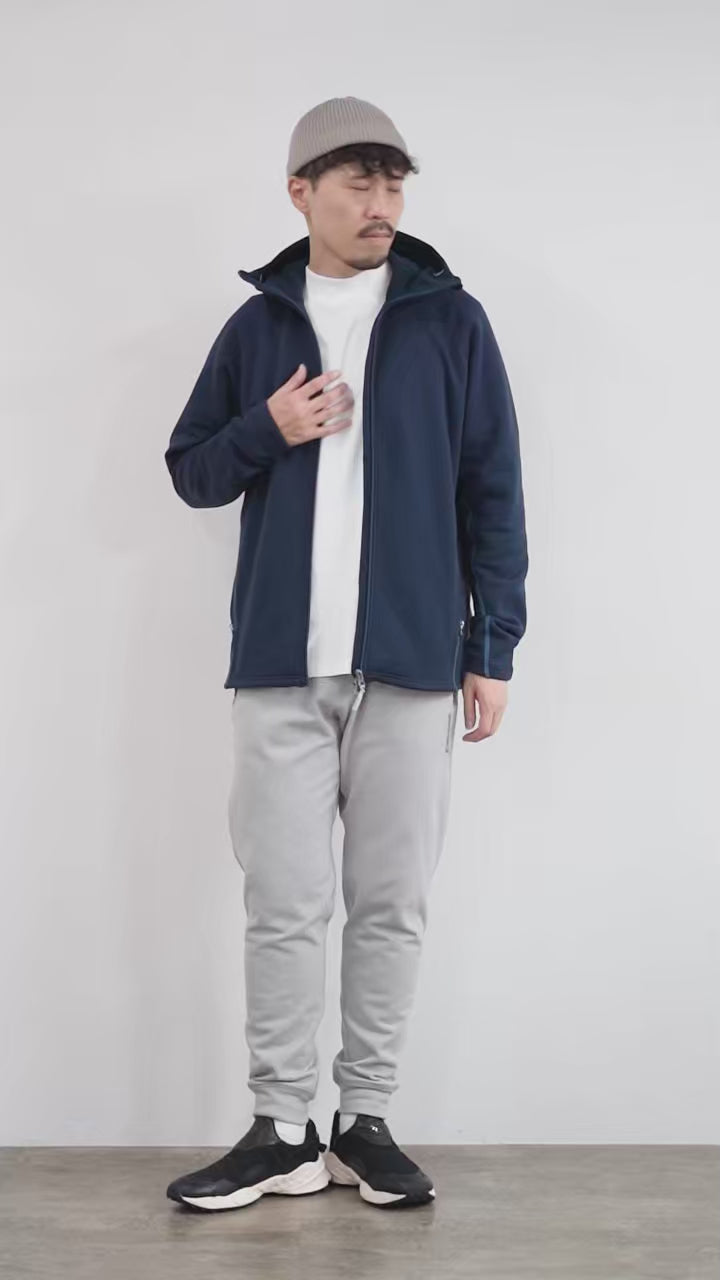 ● Staff (171cm / 61kg) Build: Average Wearing: Size M It fits comfortably, even for a mid-layer. The sleeves cover just a bit of the back of the hand, and the body has a nice amount of room. The length is enough to cover the hips. Since it’s more relaxed than the Power Hoodie, it’s great for casual wear. |