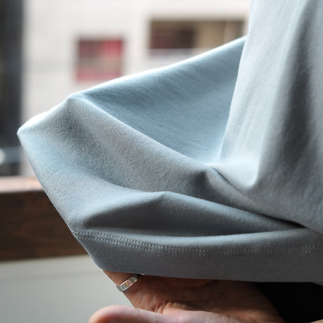 This piece uses LIFiLL’s signature “COTTONY® RIB,” a ribbed cotton fabric known for its silky handfeel and remarkable elasticity. Unlike most T-shirts that only use ribbing at the collar or cuffs, here it is used for the entire body, allowing the smoothness and stretch to be felt throughout.