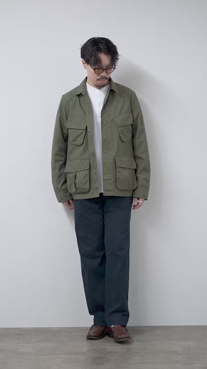 ●Staff Height / Weight: 177cm / 73kg Wearing Size: 3 Body Type: Standard Fit: Just right Length: Perfect Tried on with a long-sleeve T-shirt underneath, and the overall fit felt comfortably snug without any tightness. With enough room through the body, it’s easy to throw on over a cut-and-sew top in spring and autumn, and it should also work well with a lightweight knit in cooler weather. Though rooted in military design, the updated silhouette makes it easy to incorporate into more refined, clean looks. |
