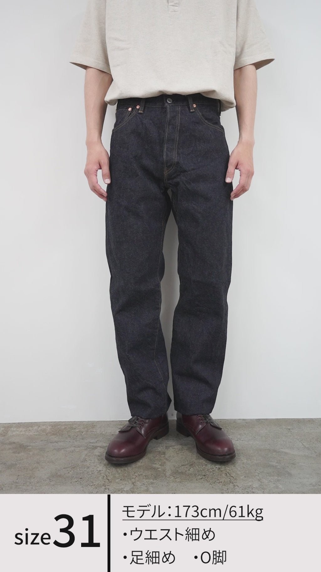 ●Staff Height / Weight: 171cm / 70kg Wearing size: 31 Body type: Standard Thigh area: Standard Fit (waist): Slightly long Length: Just right An easy-to-balance fit and the most versatile size overall. It works with a wide range of tops, making it simple to build a clean look with the denim as the focal point. |